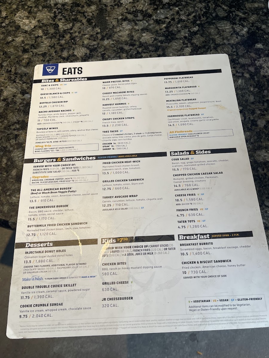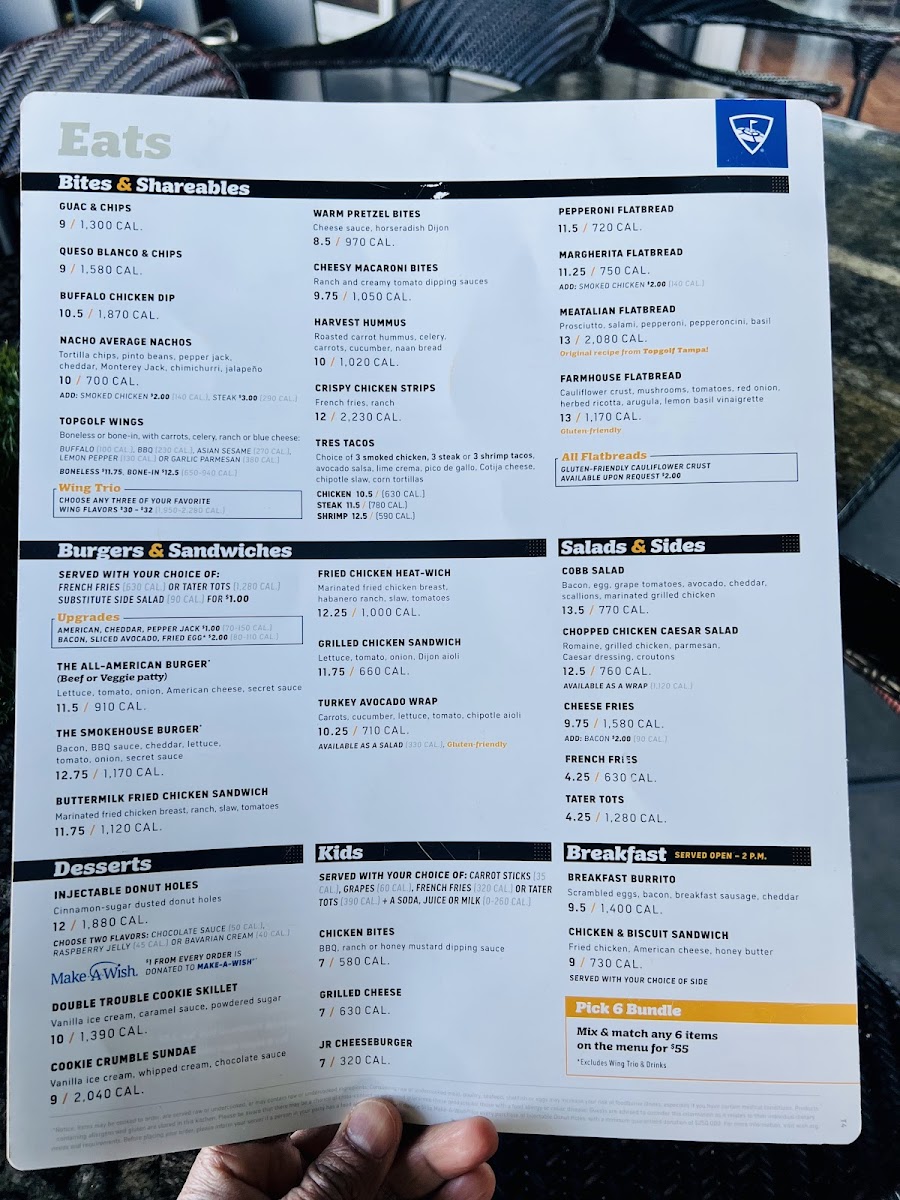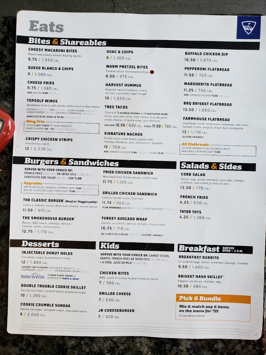The menu at Topgolf Edison offers a variety of American-style food and beverages suitable for different dining occasions, from light bites to more substantial meals. Visitors can choose from a range of appetizers, flatbreads, sandwiches, and burgers, alongside classic sides such as French fries and cheese fries. The menu also includes options like boneless wings, shrimp tacos, and breakfast-style flatbreads, accommodating different tastes throughout the day.