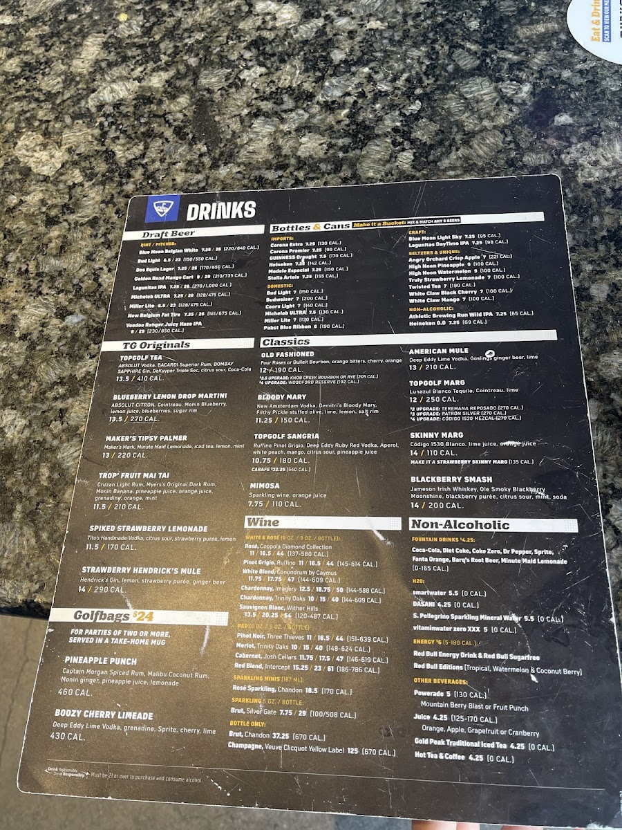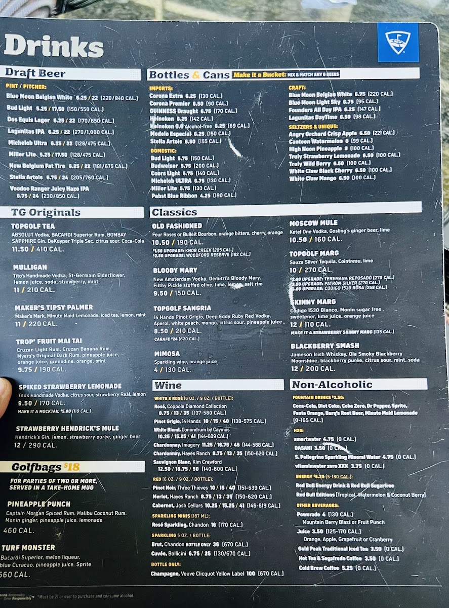 For beverages, the selection features both alcoholic and non-alcoholic drinks. Guests can find cocktails such as the Moscow Mule and TopGolf Sangria, as well as popular beers including Corona. Juice options are also available for those seeking non-alcoholic choices.